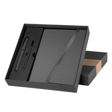 Set con libreta de pasta rígida y solapa magnética, bolígrafo metálico, repuesto de tinta y caja.
